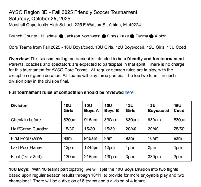 Saturday, October 25, 2025AYSO AREA D TOURNAMENT RULESTOURNAMENT SCHEDULE